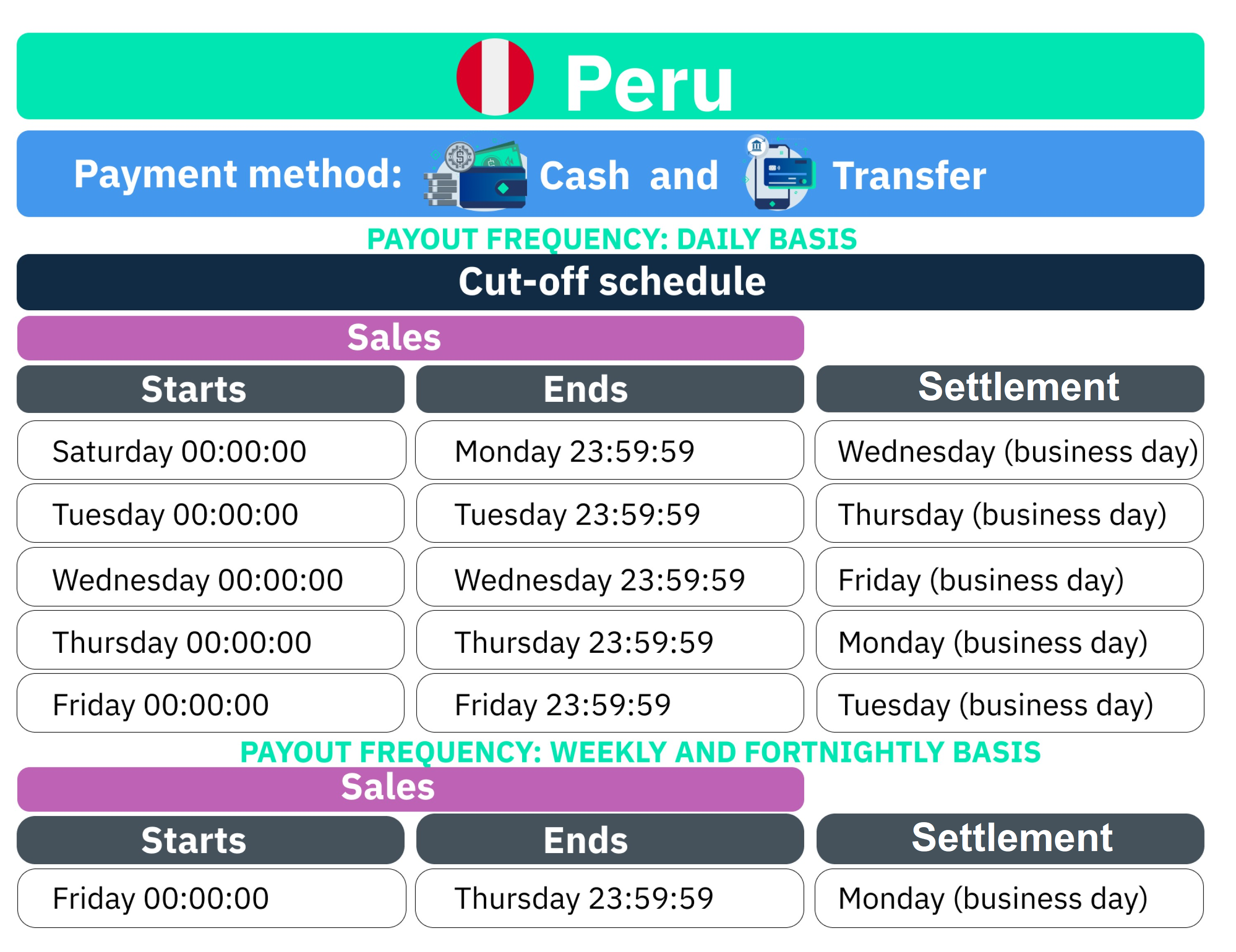 Keep in mind that deposit times depend on your client’s selected payment method, the time when the sale was made (cut-off schedule), if it is a business day (Monday to Friday, take into account that holidays are not included), and if the payout frequency is based on a daily, monthly, or fortnightly basis.