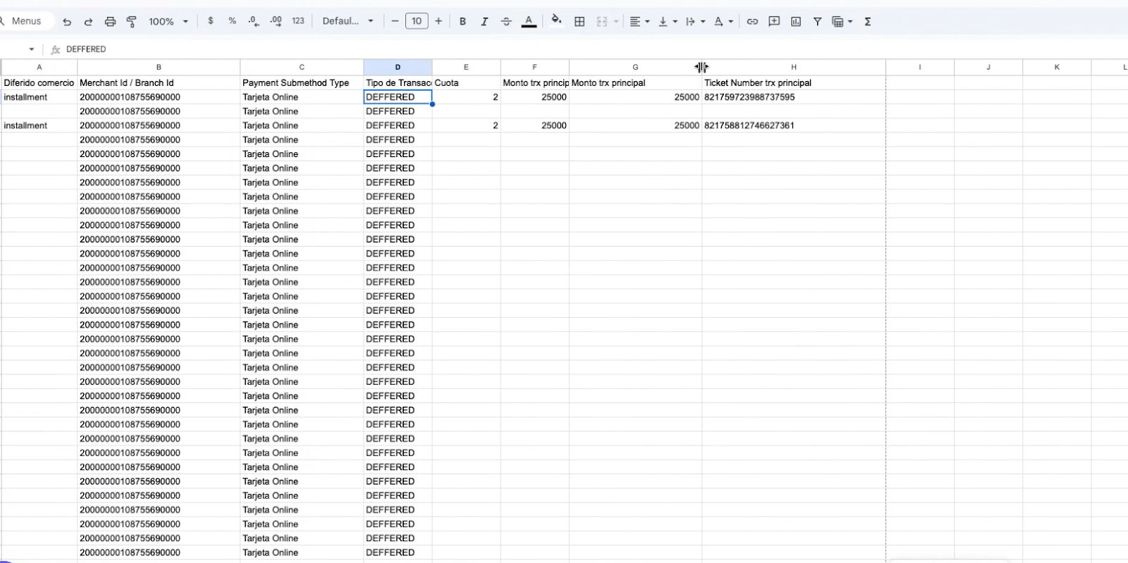 - Columna "Diferido comercio": Verás los valores installment (para los cobros de cuotas) y principal (para el monto total financiado).